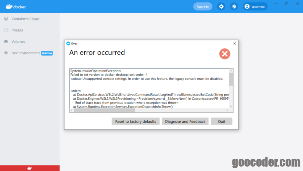 System.InvalidOperationException:Failed to set version to docker-desktop: exit code: -1stdout: Unsupported console settings. In order to use this feature, the legacy console must be disabled.