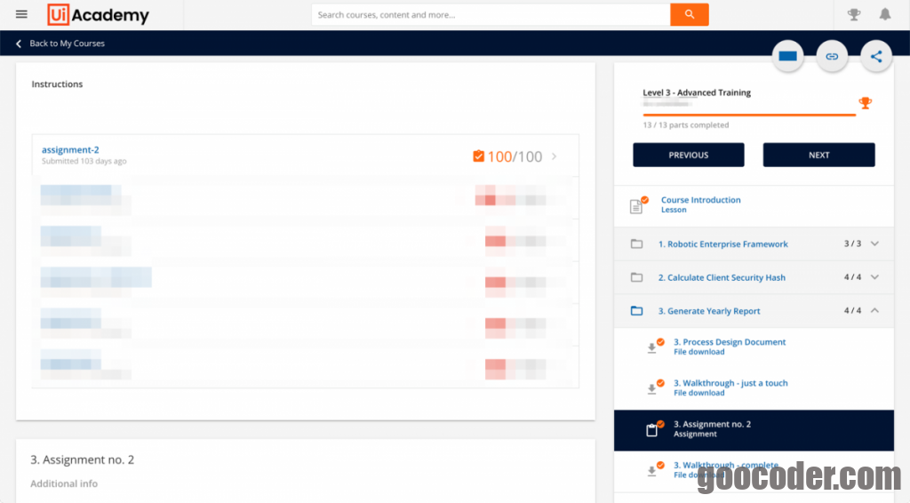 The evaluation of the assignments in the UiPath Academy 2.0 is an automatic process, checking the results of the robot running on your system. The assignment should be submitted after all items are completed by the robot, while NOT resetting the test data until getting the grade. The grade consists on the number of correct items divided by the total number of items. Grading can take a few minutes.